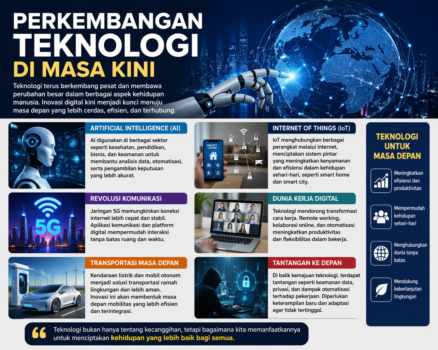 Namun, di balik kemajuan tersebut, terdapat tantangan yang perlu diatasi bersama. Dengan pemanfaatan yang bijak dan pengelolaan yang tepat, teknologi dapat menjadi alat yang membantu menciptakan masa depan yang lebih baik bagi seluruh umat manusia.
